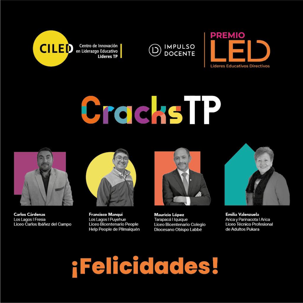 En ese sentido, CILED felicita principalmente a cuatro de los próximos premiados, quienes en su momento fueron destacados como “CracksTP”, al tener trayectorias educativo-laborales ejemplares: Carlos Cárdenas, director del Liceo Carlos Ibáñez del Campo, en la localidad de Fresia (Ver historia acá); Francisco Manqui, director del Liceo Bicentenario People Help People de Pilmaiquén (Ver historia acá); Mauricio López, director del Liceo Bicentenario Colegio Diocesano Obispo Labbé de Tarapacá (Ver historia acá), y Emilia Valenzuela, directora del Liceo Técnico Profesional de Adultos “Pukara” de Arica (Ver historia acá).