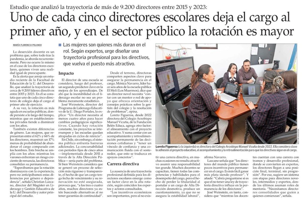 “¿Es atractivo liderar un colegio en Chile?”, es la pregunta que formulan hoy Soledad Ortúzar y Christian Lazcano, en su carta publicada en La Tercera, a raíz de su estudio que revela altos niveles de deserción en los directores, sobre todo en los primeros años y en el sector público. Al respecto, los autores plantean “implementar un acompañamiento sistemático que proporcione mecanismos de apoyo efectivos para enfrentar el desafío de liderar, especialmente en las etapas iniciales en el cargo”.