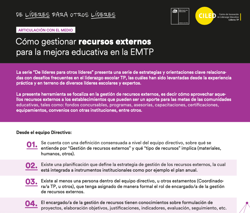 Así, la presente infografía presenta un conjunto de estrategias que, de acuerdo a diversos líderes y expertos TP resultan clave para gestionar aquellos recursos externos que pueden ser un aporte para las metas de las comunidades educativas y su mejora continua, tales como: fondos concursables, programas, asesorías, capacitaciones, certificaciones, equipamientos, convenios con otras instituciones, entre otros.