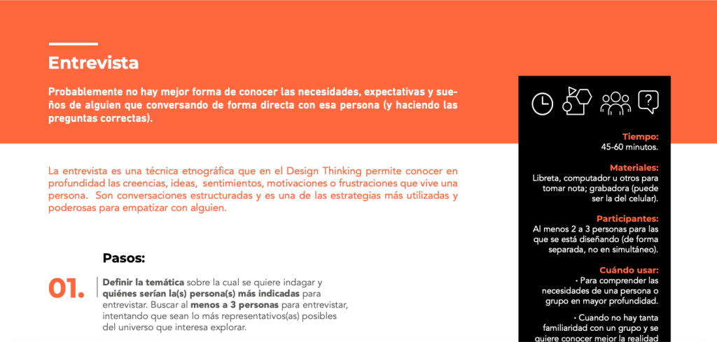 La entrevista es una técnica etnográfica que en el Design Thinking permite conocer en profundidad las creencias, ideas, sentimientos, motivaciones o frustraciones que vive una persona. Son conversaciones estructuradas y es una de las estrategias más utilizadas y poderosas para empatizar con alguien.