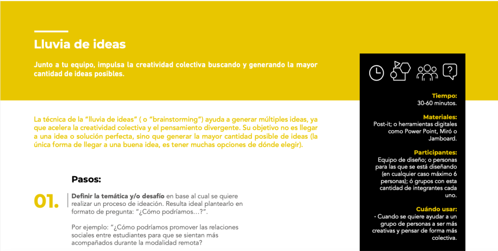 La actividad que se presenta a continuación, se basa en el manual “Design Thinking para liderar la innovación educativa” desarrollado por el CILED. Dicha actividad corresponde a la tercera fase de la metodología del Design Thinking: la fase de “Idear”.