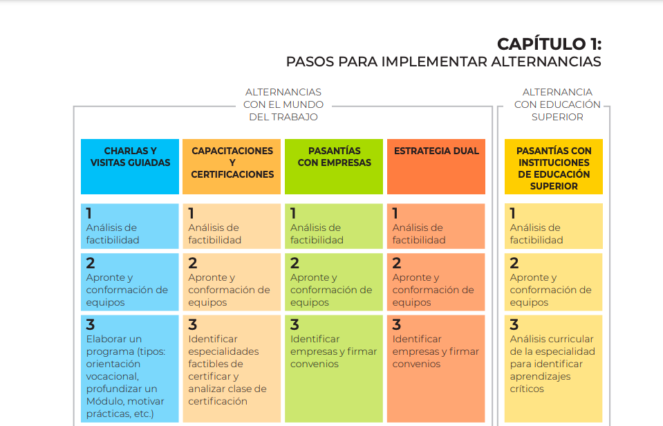 En este documento desarrollado por Fundación Chile Dual, miembro del consorcio CILED, con el apoyo del Ministerio de Educación de Chile, se describen los principales pasos para implementar 5 tipos de alternancia: Charlas y visitas guiadas; Capacitaciones y certificaciones; Pasantías en la empresa; Estrategia dual; Pasantías con Instituciones de Educación Superior.