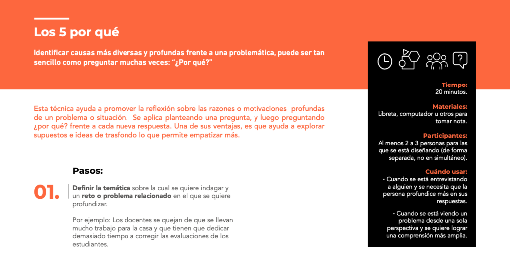 Esta técnica ayuda a promover la reflexión sobre las razones o motivaciones profundas de un problema o situación. Se aplica planteando una pregunta, y luego preguntando ¿por qué? frente a cada nueva respuesta. Una de sus ventajas, es que ayuda a explorar supuestos e ideas de trasfondo lo que permite empatizar más.