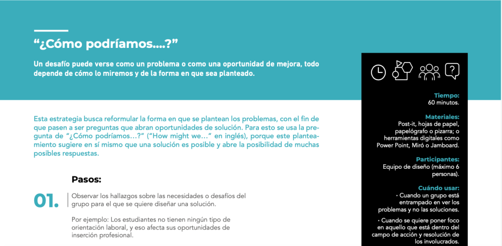 Esta estrategia busca reformular la forma en que se plantean los problemas, con el fin de que pasen a ser preguntas que abran oportunidades de solución. Para esto se usa la pregunta de “¿Cómo podríamos…?” (“How might we…” en inglés), porque este planteamiento sugiere en sí mismo que una solución es posible y abre la posibilidad de muchas posibles respuestas.