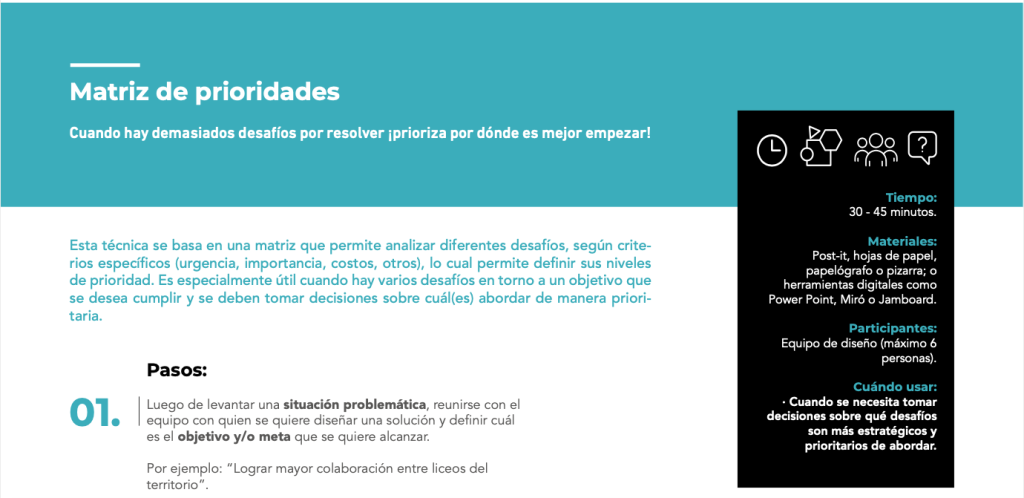 Esta técnica se basa en una matriz que permite analizar diferentes desafíos, según criterios específicos (urgencia, importancia, costos, otros), lo cual permite definir sus niveles de prioridad. Es especialmente útil cuando hay varios desafíos en torno a un objetivo que se desea cumplir y se deben tomar decisiones sobre cuál(es) abordar de manera prioritaria.