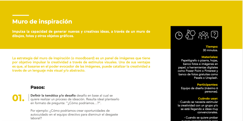 La estrategia del muro de inspiración (o moodboard) es un panel de imágenes que tiene por objetivo impulsar la creatividad a través de estímulos visuales. Una de sus ventajas es que, al basarse en el poder evocador de las imágenes, puede catalizar la creatividad a través de un lenguaje más visual y/o abstracto.