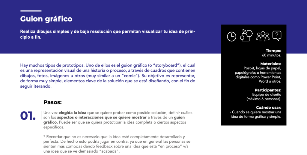 Hay muchos tipos de prototipos. Uno de ellos es el guion gráfico (o “storyboard”), el cual es una representación visual de una historia o proceso, a través de cuadros que contienen dibujos, fotos, imágenes u otros (muy similar a un “comic”). Su objetivo es representar, de forma muy simple, elementos clave de la solución que se está diseñando, con el fin de seguir iterando.