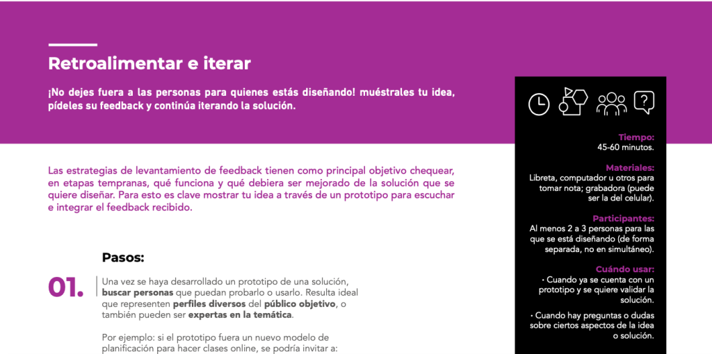 Las estrategias de levantamiento de feedback tienen como principal objetivo chequear, en etapas tempranas, qué funciona y qué debiera ser mejorado de la solución que se quiere diseñar. Para esto es clave mostrar tu idea a través de un prototipo para escuchar e integrar el feedback recibido.
