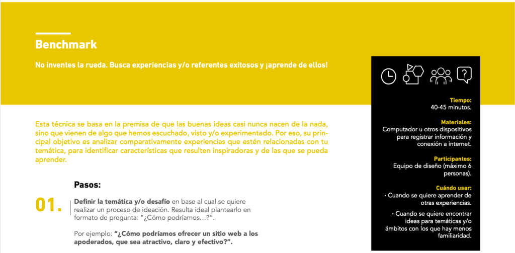 Esta técnica se basa en la premisa de que las buenas ideas casi nunca nacen de la nada, sino que vienen de algo que hemos escuchado, visto y/o experimentado. Por eso, su principal objetivo es analizar comparativamente experiencias que estén relacionadas con tu temática, para identificar características que resulten inspiradoras y de las que se pueda aprender.