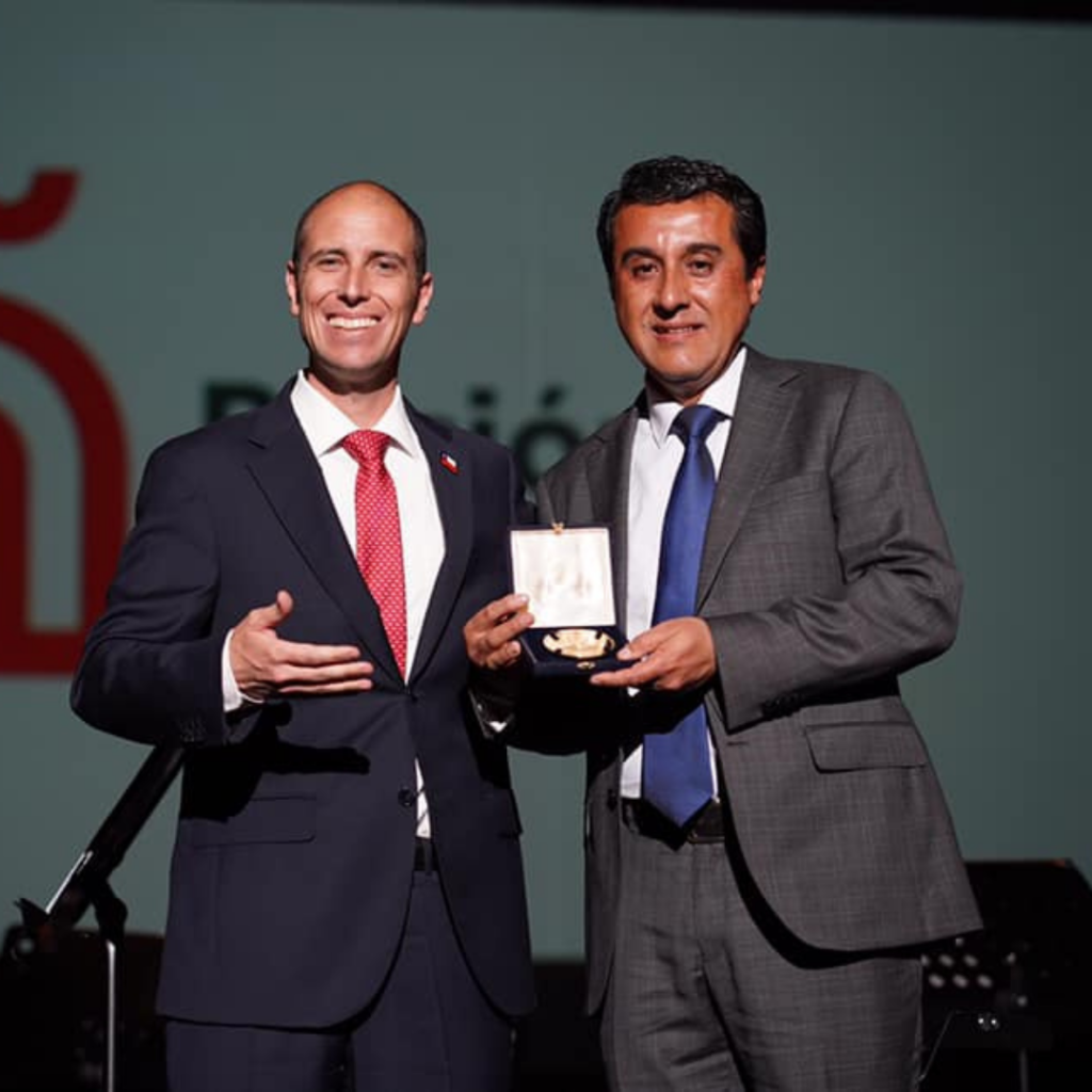 Víctor recibiendo el reconocimiento “Vicente Méndez” otorgado por el intendente de la región de Ñuble -2019-, Martín Arrau.
